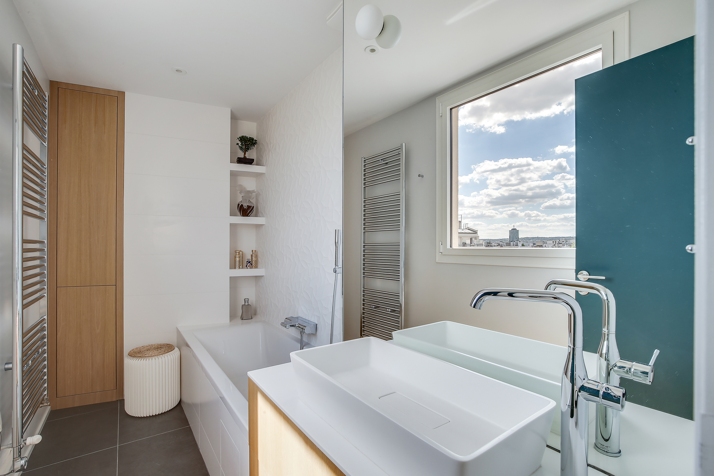 Le projet consiste à repenser entièrement un appartement situé au 9ème et dernier étage d’un immeuble des années 60 et d’aménager son toit en terrasse accessible.A l’origine, l’appartement possédait des balcons-terrasses côté rue et côté cour mais les propriétaires précédents avaient couvert celui côté cour afin d’agrandir la surface habitable du logement. Cet espace était difficilement exploitable car très étroit (environ 1,60 m) et n’était accessible que par les anciennes baies donnant sur l’extérieur. D’autre part, c’est depuis cet endroit que la vue est la plus attrayante et dégagée.C’est donc tout naturellement que nous avons souhaité relier cet espace à l’appartement en ouvrant totalement le mur de façade afin d’obtenir un seul et même volume bénéficiant d’une vue privilégiée sur la tour Eiffel. Cela a permis de rendre la pièce de vie totalement traversante et baignée de lumière.