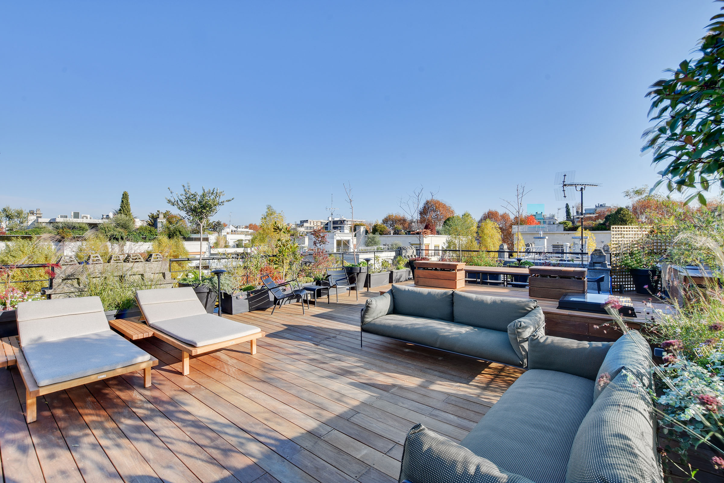 L’agence RM Architecte a imaginé un projet qui consiste à aménager en rooftop le toit inaccessible d’un immeuble d’habitation afin de créer un espace de détente atypique. La terrasse a été dotée d’un platelage sur plots en Ipé sur toute sa surface. Les édicules de ventilation présents au centre de la toiture ont également été habillés avec des lames de terrasse. Ce coffrage a divisé la terrasse en deux parties qui ont naturellement trouvé deux fonctions différentes. D’un côté, se trouve un espace salle à manger pourvu d’une grande table, d’une cuisine sur mesure et d’un coin barbecue. De l’autre, un espace « Lounge » avec coin salon et des bains de soleil propices à la détente. Des garde-corps sur mesure en acier ont été installés sur le pourtour de la terrasse afin d’assurer la sécurité des usagers. Enfin, des jardinières ont été disposées sur la terrasse afin d’apporter un peu de nature sur cette toiture. Ce filtre végétal permet également de réduire les vis-à-vis. Grâce à sa situation exceptionnelle, la terrasse jouit d’une vue imprenable sur la skyline de Paris-La Défense.